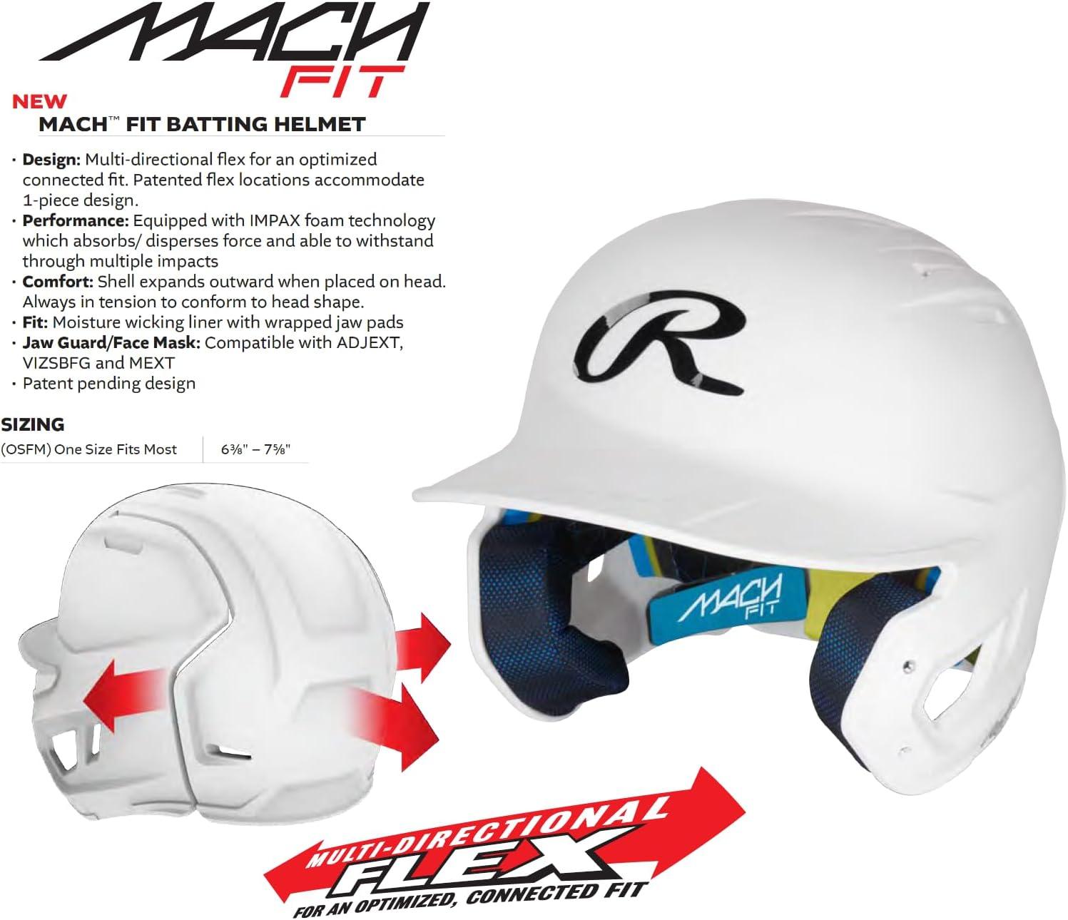Your typical baseball batting helmet has just received an upgrade thanks to the Rawlings Mach Fit Batting Helmet! Experience ultimate comfort and maximum protection with a new multi-directional flex feature, designed for an optimized and connected fit. The mult-directional flex shell expands outwards when the helmet is placed on your head, always in tension to conform to your head shape. Because of this feature, this helmet comes in one size, as one size fits most.  Furthermore, this Mach Fit Batting Helmet comes equipped with IMPAX foam technology, which absorbs and displaces the force while safely withstanding multiple impacts. For added comfort, this helmet sports a moisture-wicking liner with wrapped jaw pads. Additionally, this batting helmet is compatible with the ADJEXT, VIZSBFG, and MEXT face guards. Not to mention, we have multiple premium 1-tone matte finish color options! Whether your head shape seems to be growing or you prefer a more adaptable batting helmet, the Rawlings Mach Fit Batting Helmet has got you covered. Grab yours today!